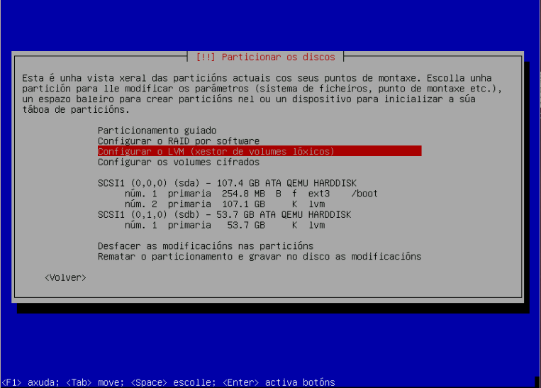 - particionamos sda para reservar un espacio para /boot (dejamos /boot fuera de LVM para evitar problemas con el arranque, aunque en las últimas versiones no es necesario)