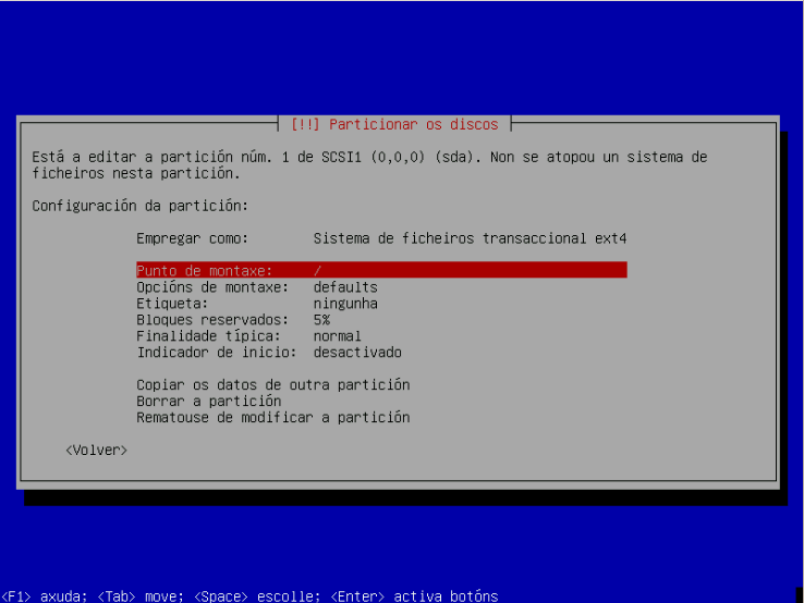 - swap - área de intercambio; siempre necesaria, tamaño función del tamaño de la RAM y del tipo de aplicaciones que se ejecuten (como orientación, tomar al menos el doble de la RAM)