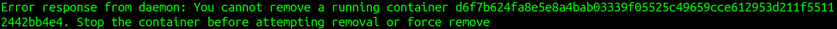 Pero es importante destacar que SI UN CONTENEDOR ESTÁ EN EJECUCIÓN NO PODEMOS BORRARLO salvo que usemos la opción -f. Si lo intentamos obtendremos un error similar al siguente: