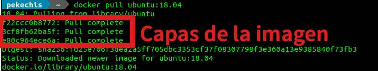 Cada una de estas instrucciones crea una nueva capa en la imagen que estamos creando. Si no ha habido cambios estas instrucciones son cacheadas y la capa previamente creada usada. Esto me permite reusar capas entre imágenes que están construidas de forma similar y basándose en las mismas imágenes de base. Esta estructura en forma de capas de las imágenes la podemos ver cuando ejecutamos la orden docker pull. Podemos apreciarlo en la siguiente imagen.