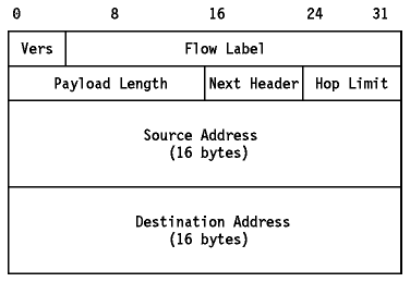 IPv6 incrementa la longitud de la cabecera IP de 20 a 40 bytes. La cabecera IPv6 contiene dos direcciones de 16 bytes(fuente y destino) precedidas de 8 bytes de control como se muestra en Figura - Cabecera IPv6. La cabecera IPv4 (ver Figura - Formato del datagrama IP) tiene dos direcciones de 4-byte precedidas de 12 bytes de control y seguidos posiblemente opciones. La reducción de la información de control y la eliminación de opciones de la cabecera tienen como fin optimizar el procesamiento del paquete. Los campos de uso poco frecuente que se han eliminado de la cabecera se han pasado a extensiones de cabecera opcionales.