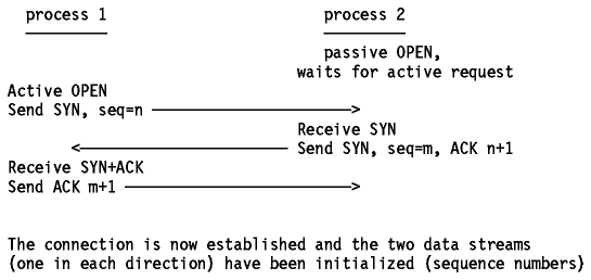 Este proceso completo se conoce como three-way handshake, o acuerdo en tres fases. Notar que los segmentos TCP intercambiados incluyen los números de secuencia iniciales de ambas partes, para ser usados en posteriores transferencias.